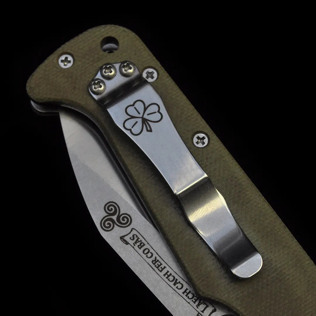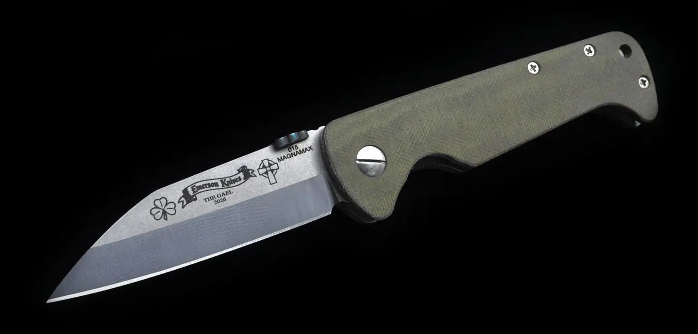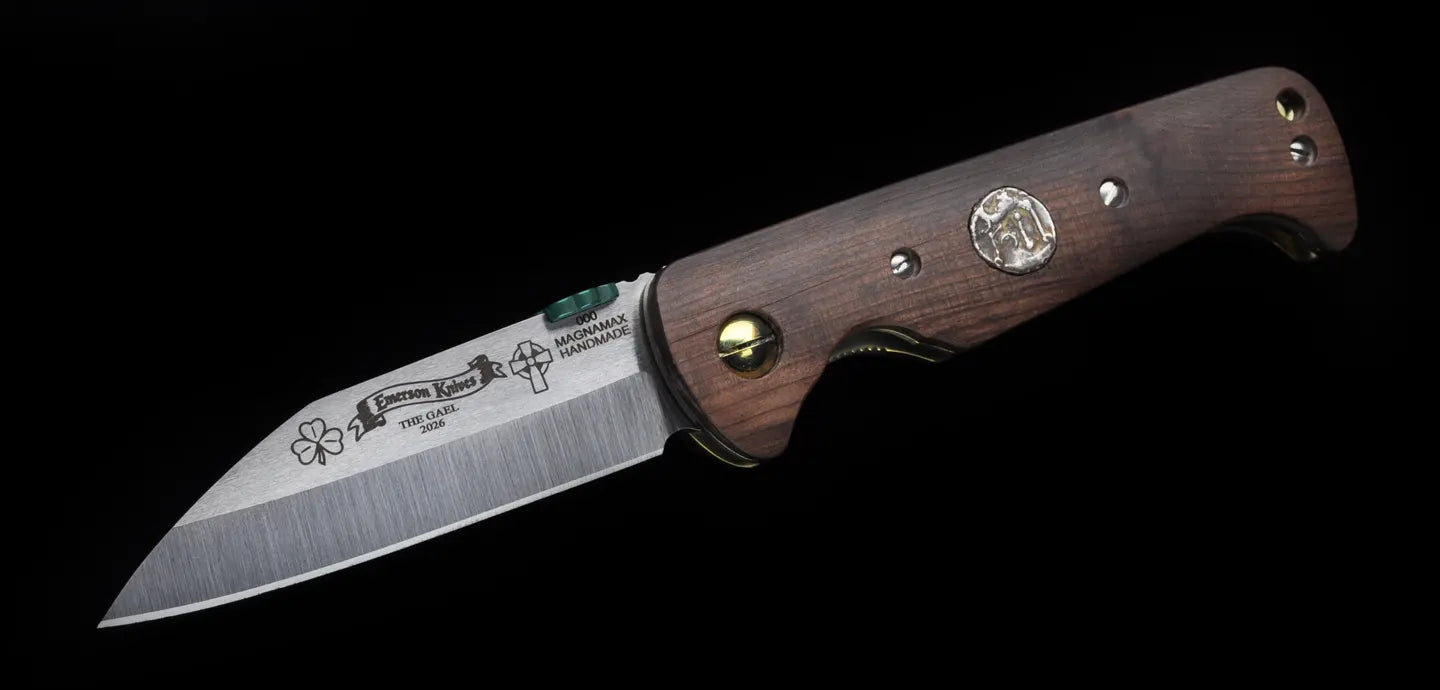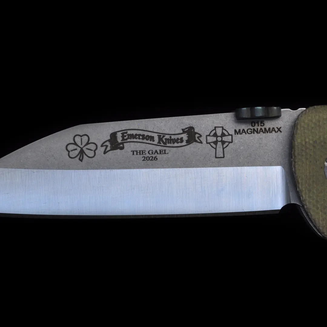 The Custom Gael Knife is hand built once each year for St. Patrick’s Day by Ernest Emerson, with only ten knives made—no more. It stands as the official Irish knife of Emerson Knives, executed in a traditional Irish blade shape and ground from Magnamax steel, then engraved with ancient Irish symbols that speak to warrior lineage, sacrifice, and legacy. The reverse of the blade bears the inscription La caech fer go bas, a quiet but absolute statement of resolve, cut permanently into steel rather than spoken aloud.