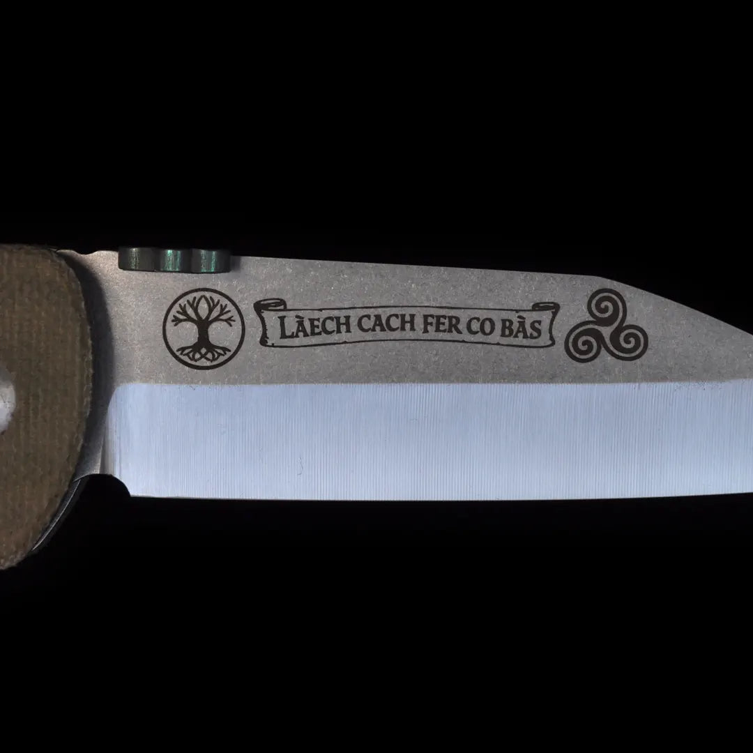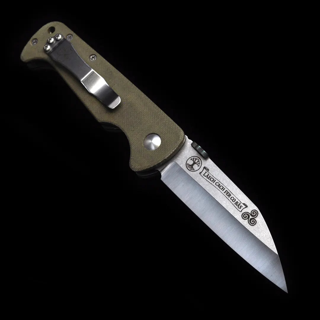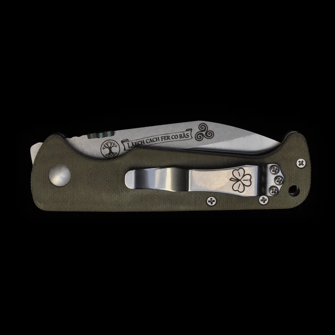 Designed for real-world use, the Gael is finished with hard-use green canvas Micarta handle scales that echo the land it honors—rugged, weathered, and unyielding. On the reverse of the blade, the engraving La caech fer go bas - Every Man a Warrior Unto Death - stands as a quiet oath, a reminder that duty and resolve are inseparable from legacy. This is not a commemorative piece meant for a shelf; it is a working knife built to be carried, used, and trusted—an annual expression of heritage forged in steel and purpose.
