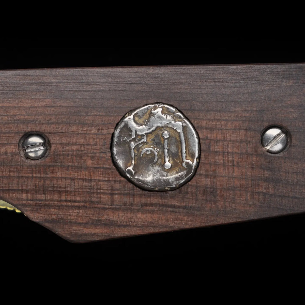 Inlaid within the handle is an authentic ancient, solid silver, Celtic coin, over 2,000 years old, adding another layer of meaning to the Gael knife. This coin is not decoration; it is history made tangible. Struck by ancient hands, it once circulated within the same cultural world that revered oak groves and lived by warrior codes. Its presence anchors the knife to a specific and irreplaceable past.